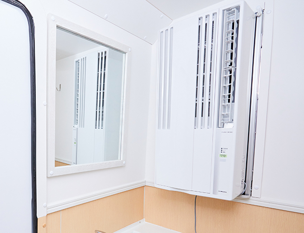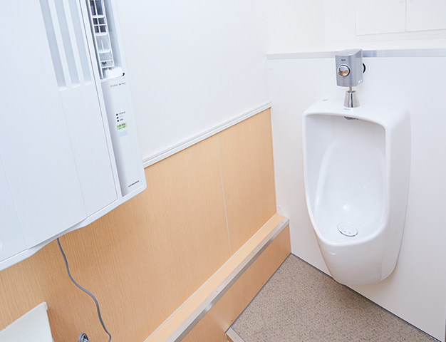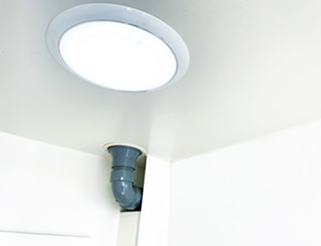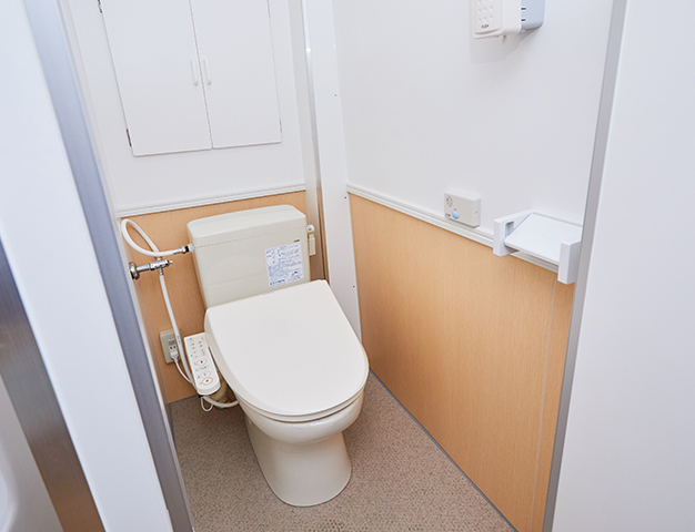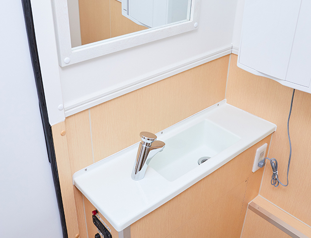 2つの個室と手洗い場付の室内は、室内高178cmで大人が立っても余裕な広々とした室内です。 さらに照明設備を標準装備しているので夜間の使用やトンネル内でもより安全にご使用頂けます。 扉付きの収納スペースを設けており、予備のトイレットペーパーや掃除道具を整理して収納できます。